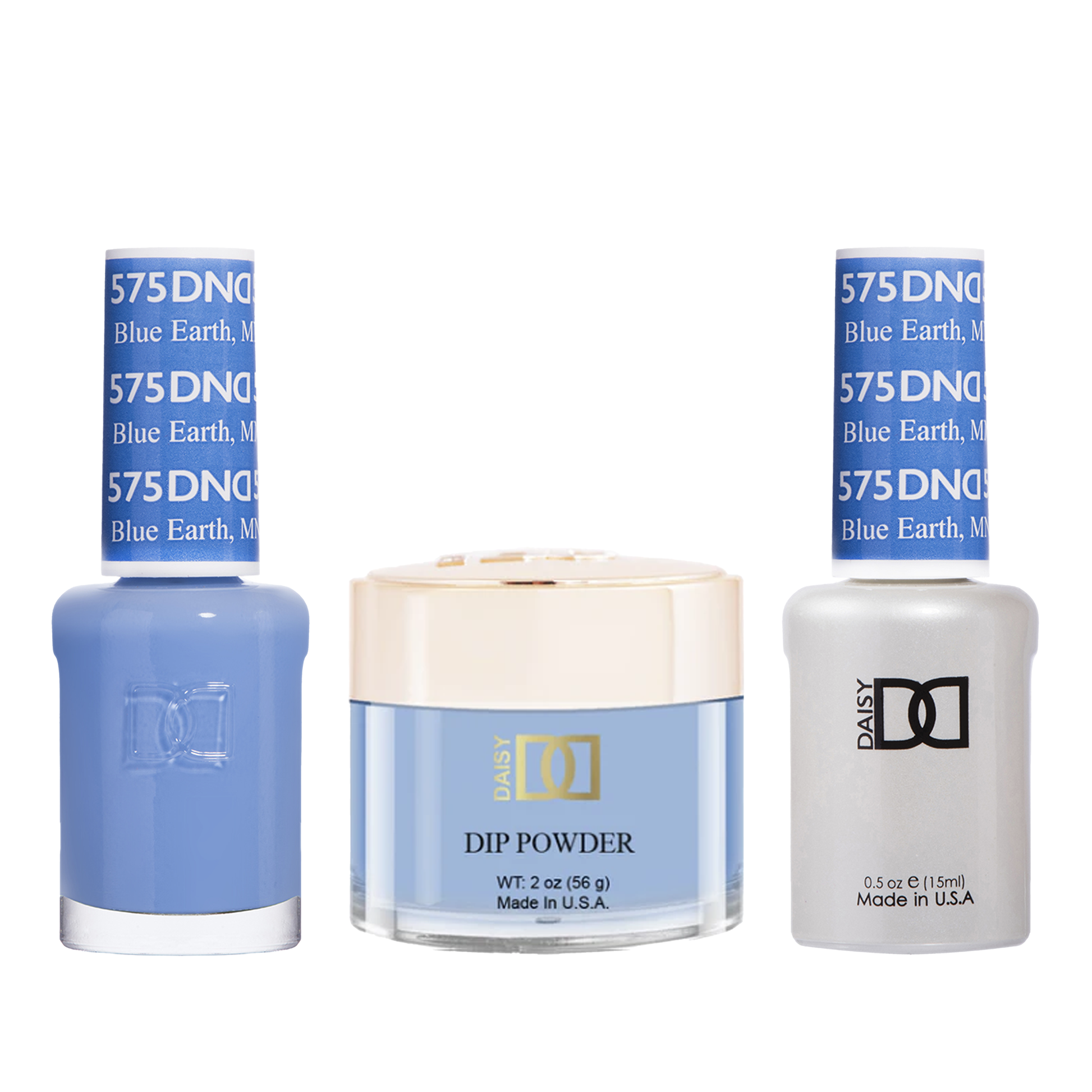 DND Trio - 575 Blue Earth includes a gel polish, a matching lacquer, and a dip powder. The set provides a comprehensive solution for a professional manicure with a long-lasting and delicate blue color. The gel and lacquer work together for a glossy finish, while the dip powder adds strength and durability to the manicure.