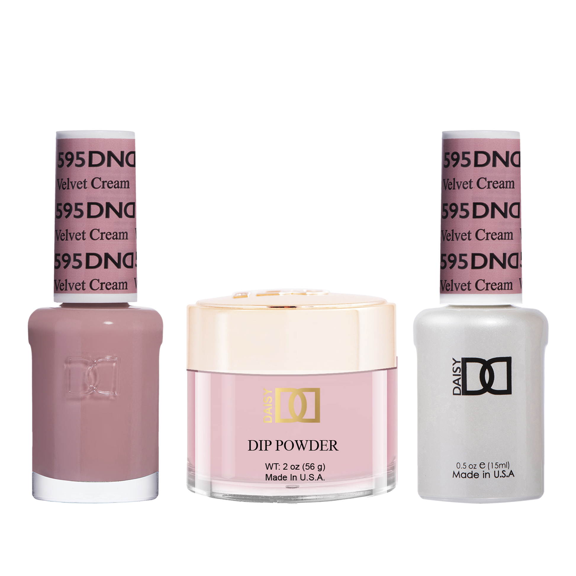 DND Trio - 595 Velvet Cream includes a gel polish, a matching lacquer, and a dip powder. The set provides a comprehensive solution for a professional manicure with a long-lasting and pink color. The gel and lacquer work together for a glossy finish, while the dip powder adds strength and durability to the manicure.