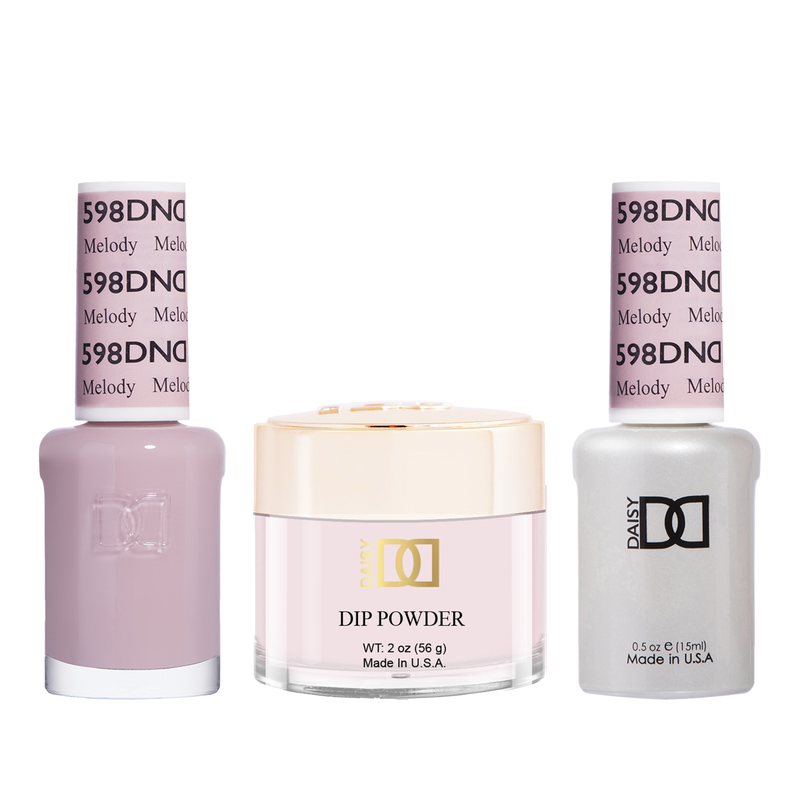 DND Trio - 598 Melody includes a gel polish, a matching lacquer, and a dip powder. The set provides a complete solution for a professional manicure with a long-lasting and pink color.