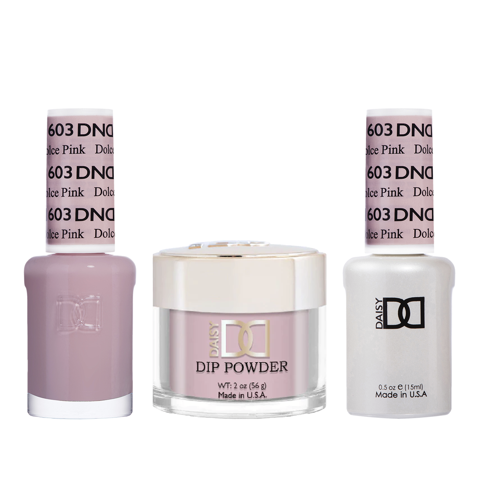 DND Trio - 603 Dolce Pink includes a gel polish, a matching lacquer, and a dip powder. The set provides a complete solution for a professional manicure with a long-lasting and light pink color.