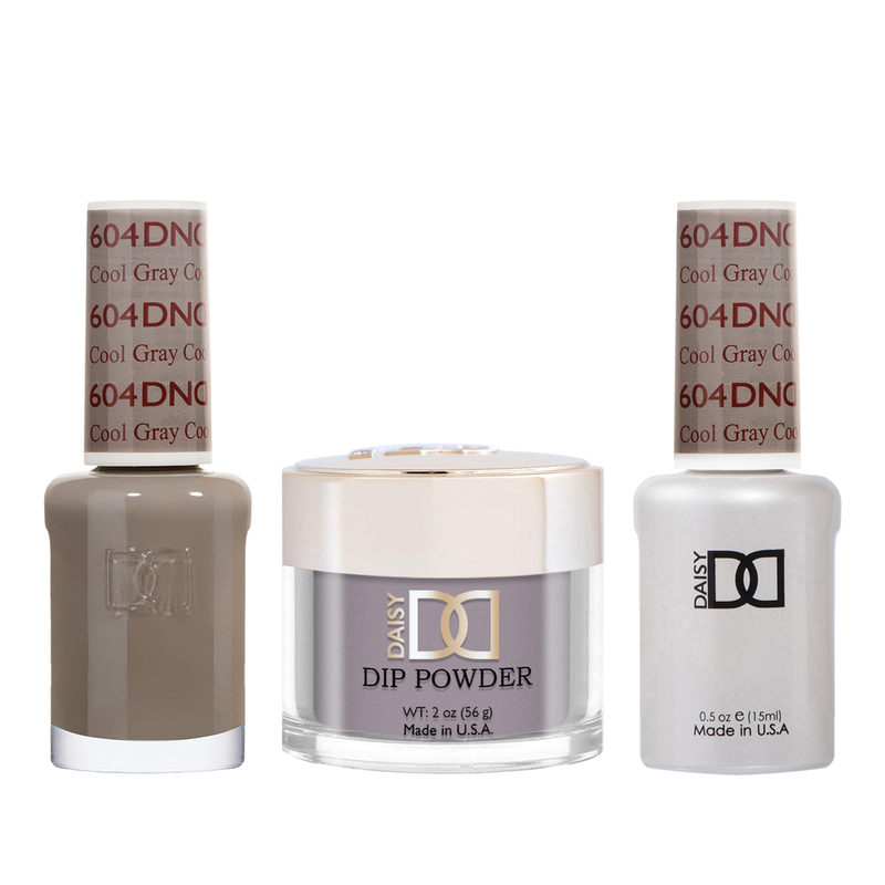 DND Trio - 604 Cool Gray includes a gel polish, a matching lacquer, and a dip powder. The set provides a complete solution for a professional manicure with a long-lasting and sandy color.