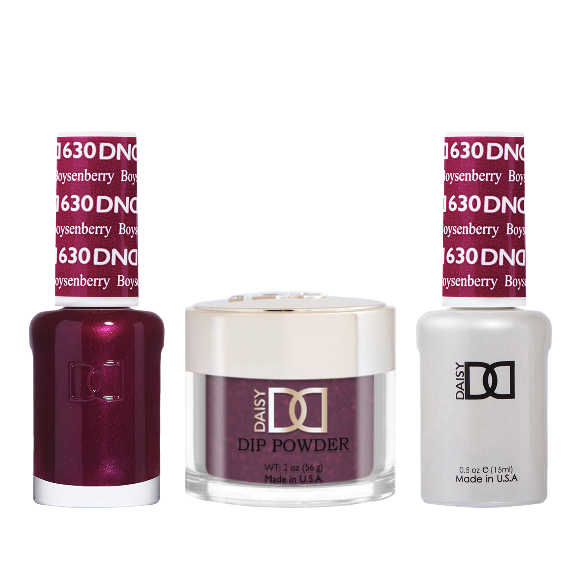 DND Trio - 630 Boysenberry includes a gel polish, a matching lacquer, and a dip powder. The set provides a complete solution for a professional manicure with a long-lasting and purplish red color.