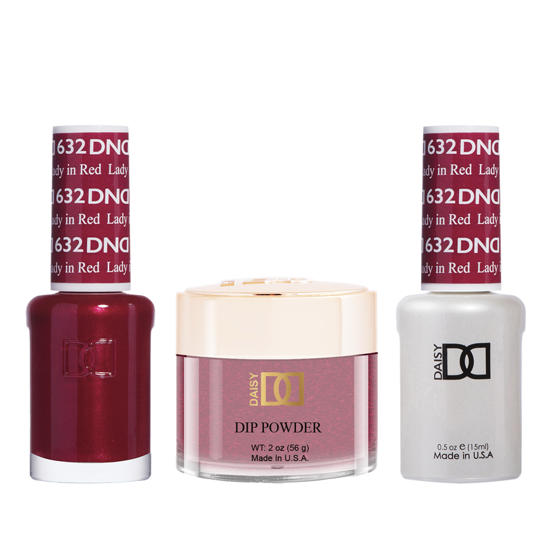 DND Trio - 632 Lady In Red includes a gel polish, a matching lacquer, and a dip powder. The set provides a complete solution for a professional manicure with a long-lasting and red color.