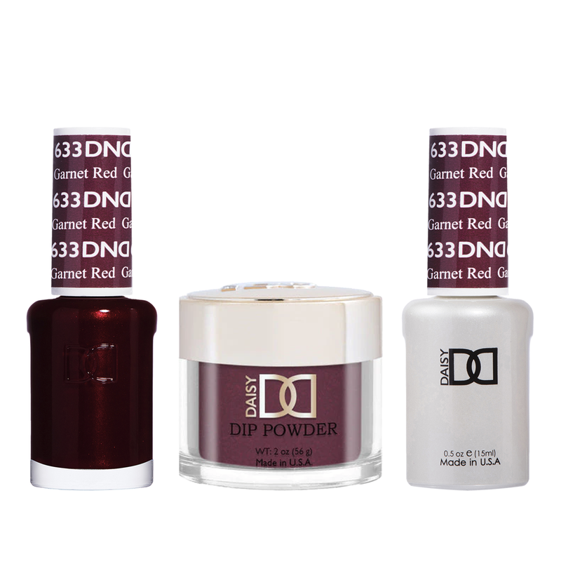 DND Trio - 633 Garnet Red includes a gel polish, a matching lacquer, and a dip powder. The set provides a complete solution for a professional manicure with a long-lasting and red color.