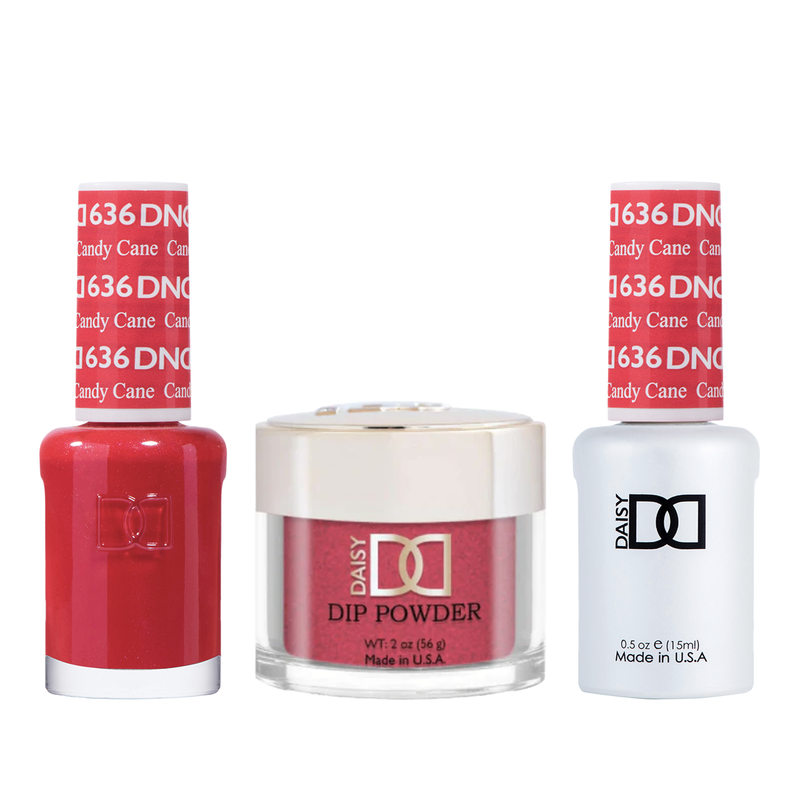 DND Trio - 636 Candy Cane includes a gel polish, a matching lacquer, and a dip powder. The set provides a complete solution for a professional manicure with a long-lasting and red color.