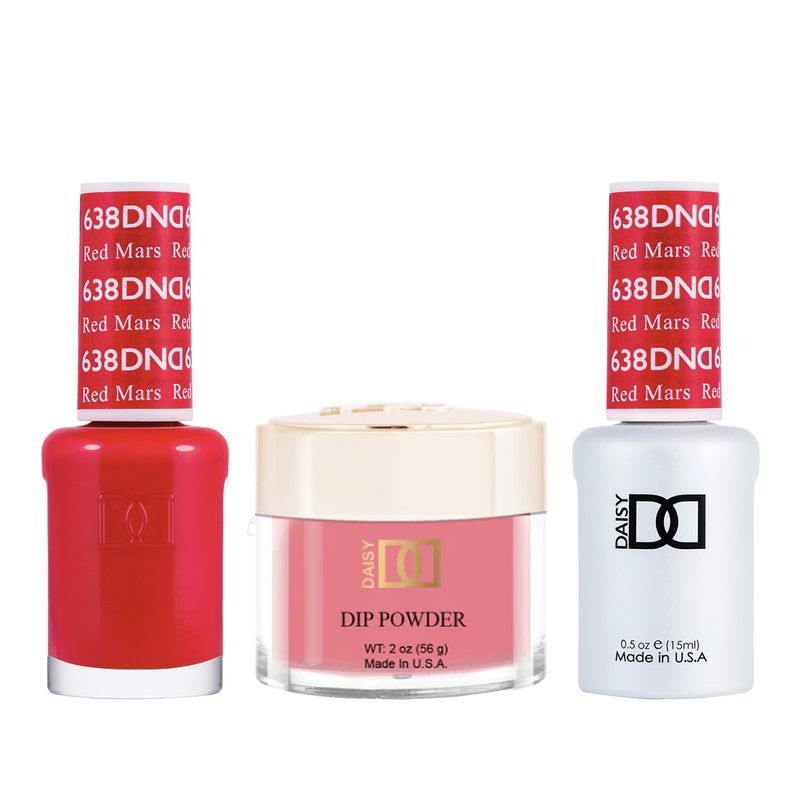 DND Trio - 638 Red Mars includes a gel polish, a matching lacquer, and a dip powder. The set provides a complete solution for a professional manicure with a long-lasting and bright red color.
