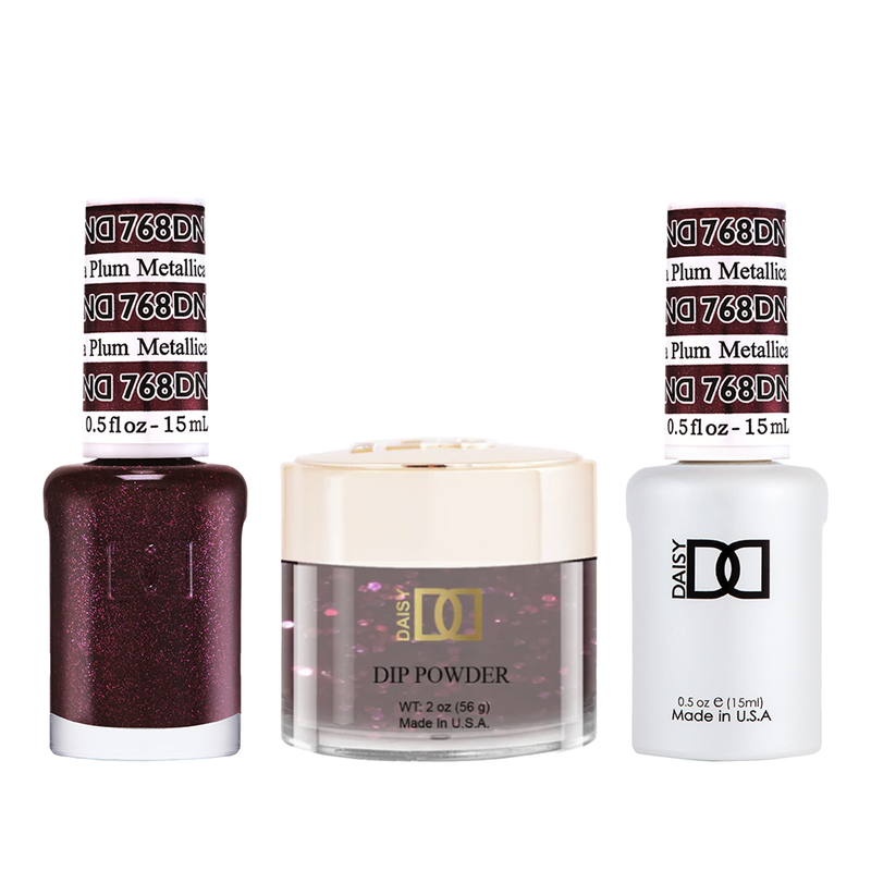 DND Trio - 768 Metallica Plum includes a gel polish, a matching lacquer, and a dip powder. The set provides a complete solution for a professional manicure with a long-lasting and beautiful color.