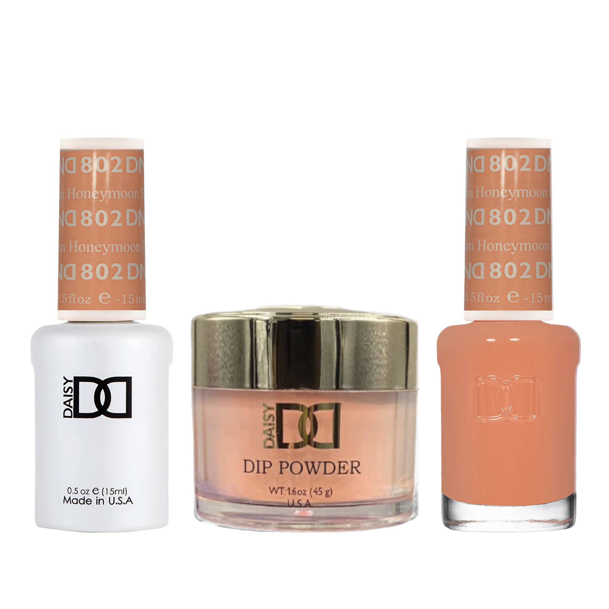 The DND Trio - 802 Honeymoon is the ultimate set for professional quality nails. This trio includes gel polish, nail polish, and dip powder, providing a flawless finish that lasts. With a variety of colors included, this set offers endless possibilities for stunning nail designs. Elevate your nail game with the DND Trio.