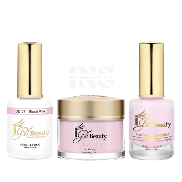 iGEL Trio 007 Blush Pink includes a gel polish, a matching lacquer and powder. The set provides a complete solution for a professional manicure with a long-lasting and beautiful color.