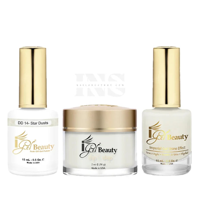 iGEL Trio 014 Star Dusts includes a gel polish, a matching lacquer and powder. The set provides a complete solution for a professional manicure with a long-lasting and beautiful color.