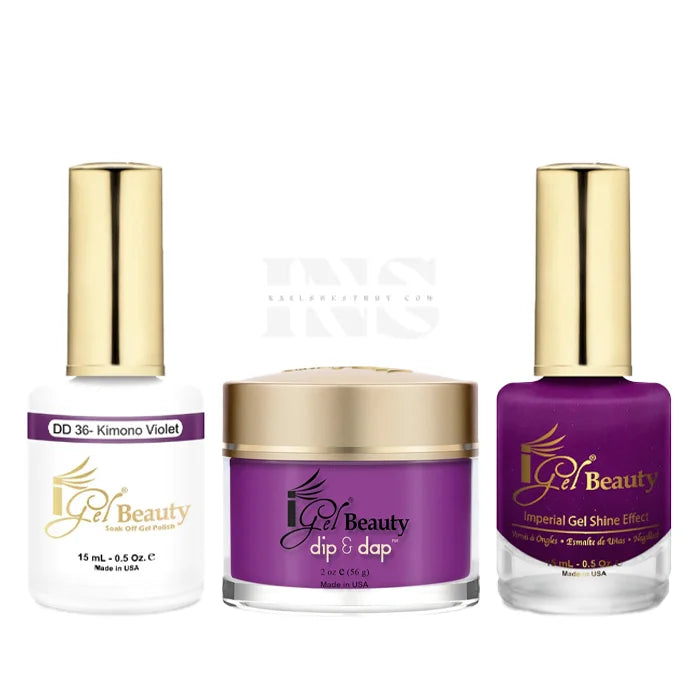 iGEL Trio 036 Kimono Violet includes a gel polish, a matching lacquer and powder. The set provides a complete solution for a professional manicure with a long-lasting and beautiful color.