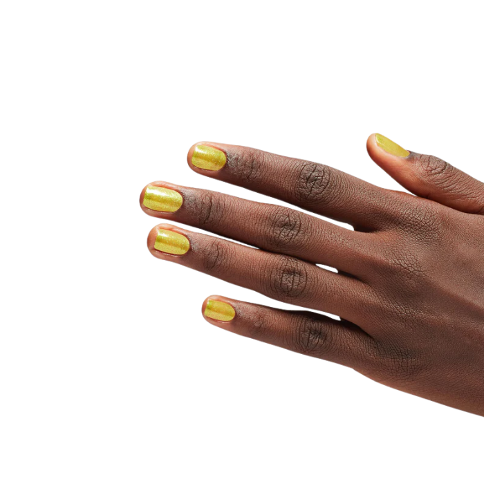 In my glowing era. This limited edition yellow shimmer long-lasting nail polish is like a pocketful of sunshine. The bright yellow base instantly boosts your mood and the warm gold shimmer keeps you on cloud shine. It's fun in the sun.